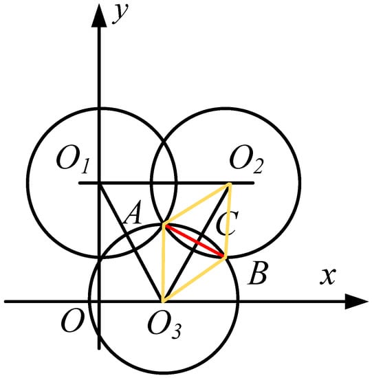 In Figure 1, O1, O2, and O3, respectively, represent the positions of the three sensor nodes. At this time, the triangle O1O2O3 is an equilateral triangle, and O3A = Rs is the sensing radius of the sensor. If ∠AO3B = π/3, AB = BO3 = O3A = Rs, according to the nature of the circle, then AB⊥O2O3, ∠AO3C = 1/2∠AO3B = π/6. According to the cosine theorem, the length of the line segment O3C is shown in Formula (4).