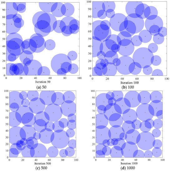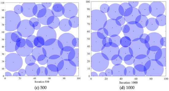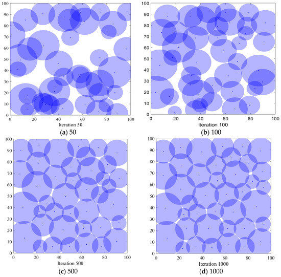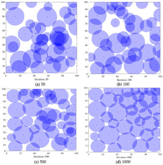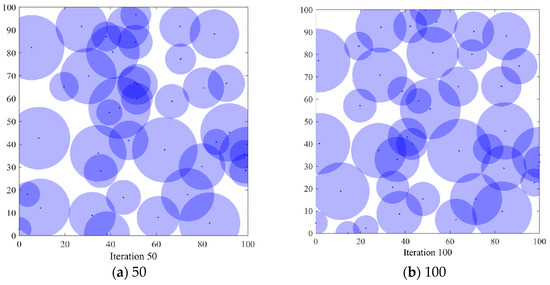 In order to verify the coverage effect of the algorithm PSO-SOA proposed in this paper, the optimal coverage simulation results of the three algorithms of the GWO algorithm and the basic SOA algorithm under different iterations from the PSO algorithm are shown in Figure 4, Figure 5, Figure 6 and Figure 7 below. Figure 4 is the simulation coverage effect of the PSO algorithm, Figure 5 is the simulation coverage effect of the GWO algorithm, Figure 6 is the simulation coverage effect of the SOA algorithm, and Figure 7 is the simulation coverage effect of the PSO-SOA algorithm proposed in this paper.