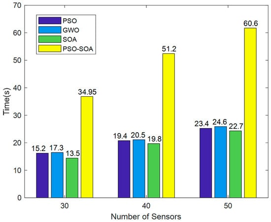 It can be seen from Figure 12 that the network of the four algorithms takes a short time when the number of sensor nodes is 40, and the PSO algorithm takes the shortest time, which is 20.77 s. The PSO-SOA algorithm proposed in this paper takes 51.2 s, and the SOA algorithm takes 19.8 s. When the network of four algorithms has 50 sensor nodes, the required time is relatively long, mainly due to the increase in the number of nodes, the intelligent optimization algorithm with increased calculation and the relatively increased simulation time. The PSO-SOA algorithm proposed in this paper takes 60.6 s, and the simulation time is relatively long. This is the problem we will solve next.