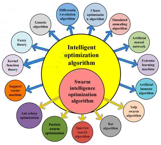 Improvements to the algorithm itself include changing the method of population initialization, optimizing the update process of individual positions, and introducing mutation operators. There are many classic improved algorithms, and the literature [90] introduced a reverse learning method in the initialization stage of the sparrow population. Ref. [91] introduced the chaotic idea into the population initialization process and adjusted the population through Gaussian mutation and chaotic disturbance to improve the population quality and expand the search range, thereby enhancing the local optimal avoidance ability of the algorithm. Ref. [92] introduced a learning coefficient in the position update part of the searcher and used the mutation operator to improve the position update of the joiner to avoid the algorithm from falling into the local space extreme value. It is also one of the commonly used improvement methods to optimize the sparrow search algorithm by combining it with other algorithms. Ref. [93] improved the position iteration formula of sparrow individuals by combining the flight idea in the bird swarm algorithm to avoid falling into the local optimum due to the rapid assimilation of individuals in the population. Ref. [94] combined the introduction of the butterfly flight method to improve the position update strategy of the discoverer and enhance the global exploration ability of the algorithm. Ref. [95] combined the random following strategy of the chicken swarm algorithm to optimize the position update process of the joiners in the sparrow search algorithm, balancing the local development performance and global search ability of the algorithm.