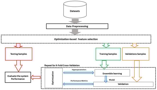 There are several ML algorithms, such as k-nearest neighbor (KNN) [], artificial neural network (ANN) [], decision tree [], and support vector machine (SVM). The main concept of these algorithms is building a learning model that can generalize and predict unseen data. For example, ANN is an intelligent learning model that simulates the biological nervous system []. One of the most common architectures of feedforward ANN is called multilayer perceptron (MLP), which comprises an input layer, a set of hidden layers, and an output layer. Ensemble ML is based on combining two or more ML models to improve the performance of the base ML models [], including ANN, KNN, and SVM. The main principle of ensemble learning is estimating an output by averaging the output values of the base ML models. In average-based ensemble learning, every base model contributes the same weight to the computation. This may result in an undesired performance of the ensemble methods. An efficient performance can be yielded by using an optimization technique to calculate the weights of the base models.