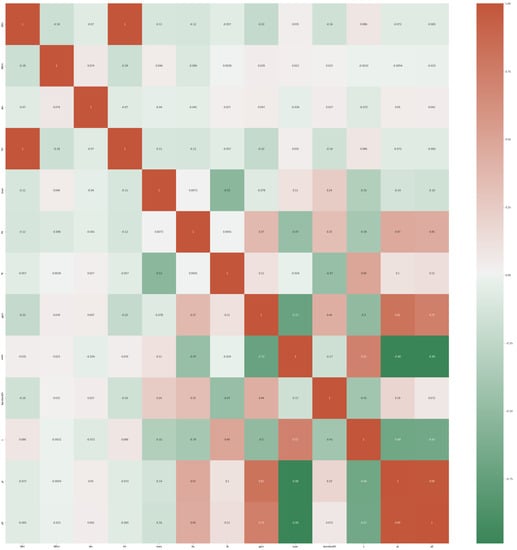 The dataset is freely available and can be utilized in constructing a machine learning model for improved radiation efficiency of an antenna []. The dimensions of a patch antenna, the dimensions of the slots in the patch antenna, the operating frequency, and finally, the matching S11 parameter are all included in this dataset. The HFSS program was utilized in the construction of the antenna as well as the collection of the dataset. Ansys HFSS is a software tool utilized to design and simulate high-frequency electronic devices. This 3D electromagnetic (EM) simulation software is specifically tailored for creating and evaluating various products, including antennas, antenna arrays, filters, connectors, and printed circuit boards. Its primary purpose is to provide accurate modeling and analysis capabilities for the development of these high-frequency electronic systems. The radiation frequency of the tested dataset is maintained at 2.4 GHz, making it compatible with Bluetooth and wireless local area network (WLAN) operations. Figure 2 presents a heat map that can be used to gain insight into the manner in which the variables are connected.