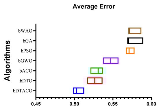 The proposed bDTACO method, together with the bDTO, bACO, bPSOm bGWO, bGA, and bWOA algorithms, are compared using a box plot that is based on the average error for each algorithm.