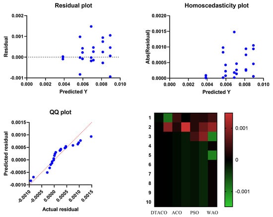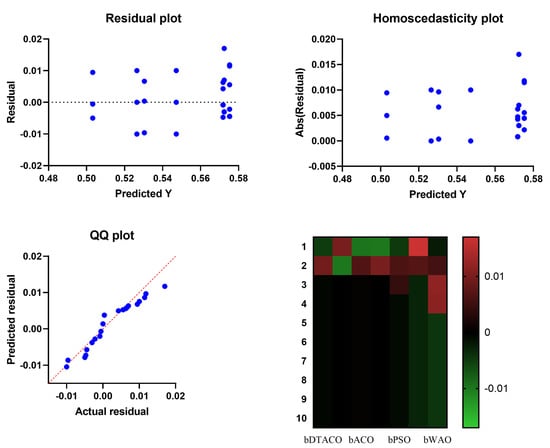 Figure 3 displays the box plot that was generated based on the average error for the bDTACO algorithm, as well as the bDTO algorithm, the bACO algorithm, the bPSO algorithm, the bGWO algorithm, the bGA algorithm, and the bWOA algorithm. The quality of the bDTACO algorithm, as determined by utilizing the objective function described in Equation (16), is displayed in the figure. Figure 4 presents the quantile–quantile (QQ) plots, residual plots, and heat map for both the given bDTACO and the methods that were compared for the data that were analyzed. These plots show the relationship between the data and the quantiles and quantile differences.