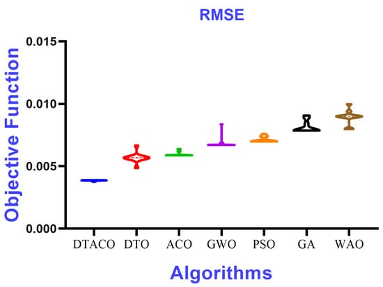 Figure 5 displays the box plot calculated using the root-mean-squared error for the proposed DTACO-based model as well as the DTO, ACO, PSO, GWO, GA, and WOA-based models. The quality of the optimized ensemble DTACO-based model, as shown in the figure, was determined with the help of the objective function described in Equation (16). Figure 6 depicts the histogram of the root-mean-squared error (RMSE) for both the DTACO-based model that was presented and the other models. Figure 7 shows the ROC curve of the presented DTACO algorithm versus the DTO algorithm. Figure 8 presents the QQ plots, residual plots, and heat map for both the DTACO-based model that was provided and the models that were compared for the data that were investigated. Both sets of plots are based on the analyzed data. These figures demonstrate that the given optimized ensemble DTACO-based model has the potential to outperform the models that were compared.