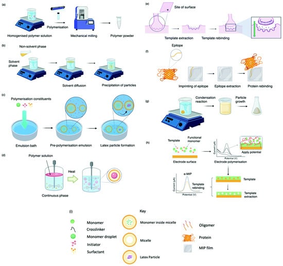 Schematic representation depicting various polymerization techniques: (a) bulk, (b) precipitation, (c) emulsion, (d) suspension, (e) surface, (f) epitope, (g) sol-gel, (h) electro-polymerization, and (i) each technique’s related key [25].