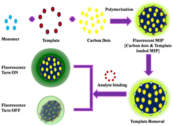 MIP-based optical sensors are known for their simplicity, ease of manufacture, and ability to achieve a very low detection limit. MIP-based optical sensors contain MIPs as the recognition unit to interact and bind significantly with the desired target analyte and as the transducer component for signaling the binding event. MIPs in the sensors typically enhance their specificity by binding specifically to the targeted analyte of interest. Furthermore, various types of MIP-based optical sensors, such as fluorescence, colorimetric, surface plasmon resonance, and surface-enhanced Raman scattering (SERS), have made considerable advancements in recent years to detect toxic pollutants as well as in bio-sensing applications [77]. These sensors use the principles of change in light intensities [73,76]: (i) signal to turn off, or (ii) signal to turn on [78], which is depicted in Figure 3 and Figure 4. For instance, in fluorescence-based sensors, the specific binding of fluorescentMIPs with target analytes resulted in either enhancement or quenching of the fluorescent signal, resulting in the detection and further quantification of analytes [79].