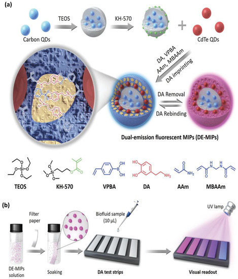 (a) Schematic representation of dual-emission fluorescent MIP nanoparticles (Dual emission-MIPs) with specific dopamine affinity. (b) The dual emission-MIPs-coated filter paper as a facile dopamine test strip for visual detection. Copyrights reproduced with permission from John Wiley and Sons [113].