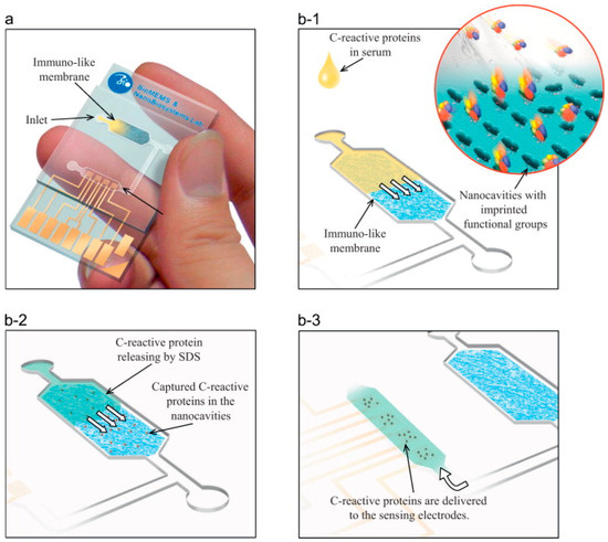 The representation of the MIP-based nanocavities (immuno-like membrane in the microfluidic system (a); loading of serum samples into the microfluidic system and capturing C-reactive protein from serum samples (b-1); loading of SDS and releasing of C-reactive protein from the immuno-like membrane (b-2); delivery of SDS with C-reactive protein to the electrodes (b-3)). The figure is reproduced with permission from Elsevier [120].