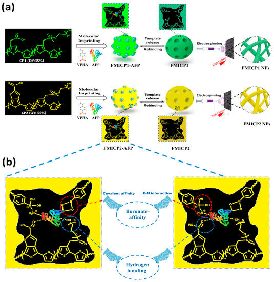 Principles and strategies of FMICP and FMICP NF biomarker assays: (a) Synthesis of the conjugated polythiophenes linked—molecular-imprinting strategy and fabrication of their fluorescent nanofibers using an easy and low-cost electrospinning approach, as well as their interactions with the AFP (alpha-fetoprotein) biomarker. (b) Mechanism of dual-emission CPs linked with boronate-affinity molecular-imprinting strategies The figure is reproduced with permission from Elsevier [121].
