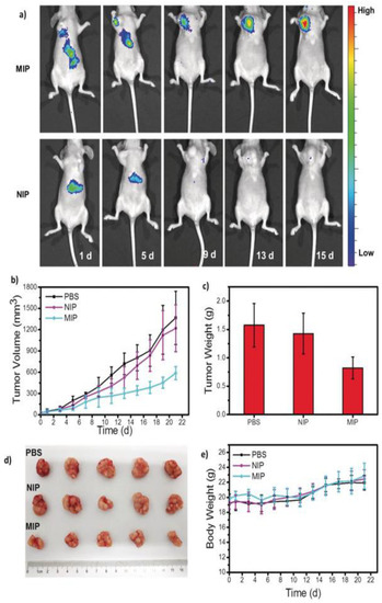 (a) Schematics showing the mechanism of inhibition of breast cancer growth by MIP NPs; (b) Confocal images of breast cancer cells stained with FITC-doped silica NPs imprinted with HER2-glycan (MIP) and nonimprinted NPs showing absence of fluorescence; (c) In vivo imaging of the tumor after intravenous injection of MIP and NIP doped with an infrared dye confirms the accumulation of MIP at the tumor site; (d,e) Effect of MIP/NIP on the tumor volume in mice after treatment. The figure is reproduced with permission from John Wiley and Sons [126].