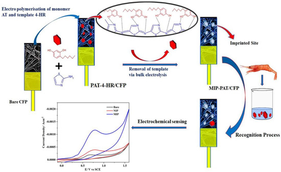 Ghaani et al. developed a MIP-based novel electrochemical sensor for the detection of 4,4′-methylene diphenyl diamine (MDA), a primary aromatic amine typically used in the preparation of polyurethane foams but found to have carcinogenic properties—electrodeposition-coated MIP with multiwalled carbon nanotube (MWCNT) on glassy carbon electrodes. The MWCNT improved the sensor’s sensitivity through its antifouling properties. Furthermore, the different parameters, such as incubation time, scan cycles, elution time, pH, and molar ratio of template molecules to monomers, were optimized to enhance the sensor’s sensitivity with a final LOD value of 15 nM. The actual sample analysis of MDA was performed, and the recovery rate was between 94.10% and 106.76% [129]. Zhou et al. designed the gold nanoparticles/reduced graphene oxide (AuNP/RGO) modified MIP sensor for the selective detection of nitrofurazone (an antibiotic drug). In this, o-phenylenediamine (o–PD) was used as a functional monomer in MIP preparation. Here, the differential pulse voltammetry (DPV) technique was used to detect nitrofurazone by redox probe ([Fe (CN)6]3−/4−) with a low detection limit of 0.18 nmol L−1 and also produced a reasonable recovery rate of 99.06–101.46% inaccurate water analysis [130]. A cost-effective electropolymerized sensor for the detection of food additives in shrimp was developed by George et al., as shown in Figure 9 [131]. 2-aminothiazoleon carbon fiber paper electrode (PAT/CFP) was electro-polymerized in the presence of 4-hexylresorcinol (4-HR) to detect 4-HRin shrimps by the DPV method. This system has a low detection limit of 6.03 nM for 4-HR in shrimps, with the highest recovery rate of 98.23% to 100.14% [131].