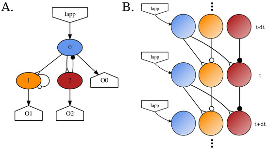 Simulation method for a small example network using the SNS-Toolbox. (A) Overall network diagram generated within the toolbox. (B) Diagram of the general computational flow when simulating the network. The network is unfolded in time, and neural voltages are propagated in feedforward layers from one time-step to another.