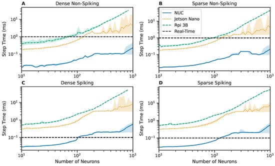 The exact threshold for what could be considered real-time performance is dependent on the simulation step size, which, in turn, is dependent on the membrane properties of neurons within the network. While all networks in this test were simulated with the same step size for consistency, accurately simulating spiking networks will generally require a finer simulation step than non-spiking networks. In this test, an elapsed time of 0.1 ms per step is considered real-time for the spiking networks. A step size of 1 ms would suffice for the non-spiking networks tested in this section, so their real-time limit is 1 ms. For non-spiking networks, this means that networks up to about 3000 neurons can be simulated in real-time, and for spiking networks the threshold is about 100–200 neurons.
