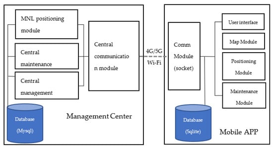 The main functions of the back-end processing center included management operations, user administration, communication interface, backup and updates, and storage of data such as maps and fingerprint information. Fingerprint information processing can be easily downloaded and used by terminals. The back-end processing center undertakes the computationally intensive and complex process of system positioning and communicates the computation results to the terminal through cloud technology so that the end user can download.