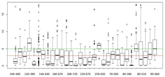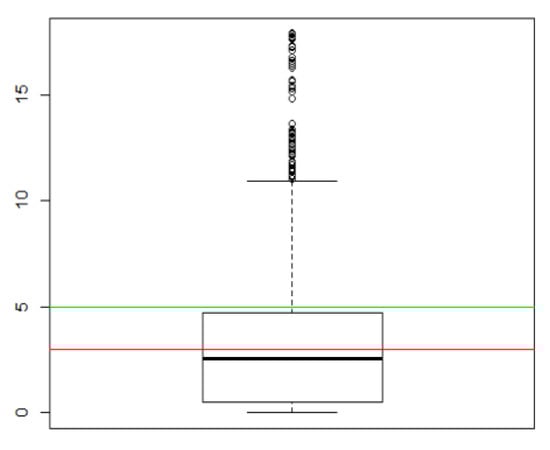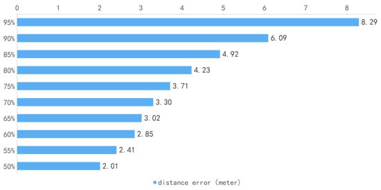 First, the difference between the actual and calculated location coordinates was calculated. Then, the error distance was calculated based on the scale of the map coordinates. In this experiment, 31 locations were randomly selected in the field, and a total of 3419 valid data points were collected. The overall performances of the tests are shown in Figure 5, Figure 6 and Figure 7, where indicate the overall accuracy of all test samples. The red line specifies the 3 m error, and the green line represents the 5 m error in Figure 5 and Figure 7.
