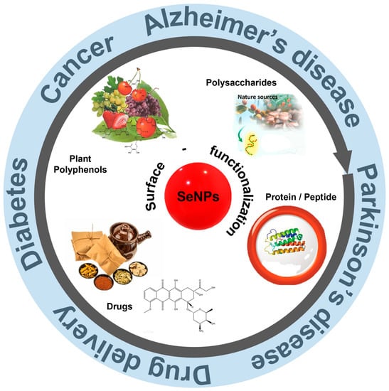 To address these concerns, nanoscale selenium (SeNPs) with different forms, such as nanowires, nanorods, and nanotubes, have been proposed [8]. Moreover, SeNPs have become increasingly popular in biomedical applications owing to their high bioavailability and bioactivity, and are widely used in oxidative stress-induced cancers, diabetes, and other diseases [9,10]. For example, Fan et al. [11] investigated the antioxidant and protective effects of SeNPs in streptozotocin (STZ)-induced diabetic rats. The results showed that SeNPs were able to mitigate oxidative damage caused by diabetes. In addition to antioxidative ability, SeNPs also possess anticancer potential, and thus can be used as chemoprevention drug. However, pure SeNPs still encounter problems when applied in disease therapy because of their poor stability. Surface functionalization strategy sheds light to overcome these limitations in biomedical applications. With in-depth research, SeNPs have been greatly expanded for both synthesis and application. At the same time, the surface modification of SeNPs also makes the functions more diversified, and its applications are more extensive, such as in tumor and neurodegenerative disease treatment and drug delivery (Figure 2). This review summarizes the synthesis methods of SeNPs and emphasizes the functionalization strategies to improve the bioactivity of SeNPs. The development of SeNPs in the treatment of brain diseases are also reviewed.