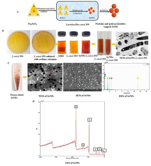 (A) Schematic representation of the hypothesis of SeNPs synthesis by the probiotic Lactobacillus casei 393. (B) Macroscopic schematic of SeNPs biosynthesis, and TEM images. (C) Extracted biogenic biomolecules capped-SeNPs powder appeared dark red after freeze-drying. Moreover, these SeNPs were with the size of 50–80 nm particles analyzed via scanning electron microscopy (SEM) and TEM, and composition of carbon (C), nitrogen (N), oxygen (O), selenium (Se) and phosphorus (P) elements were analyzed via energy dispersive X-ray spectrometry (EDX). (D) Extracted biogenic biomolecules capped-SeNPs contained C, N, O, Se and P elements via X-ray photoelectron spectroscopy (XPS) analysis. Reprinted from [46] with permission from Elsevier.