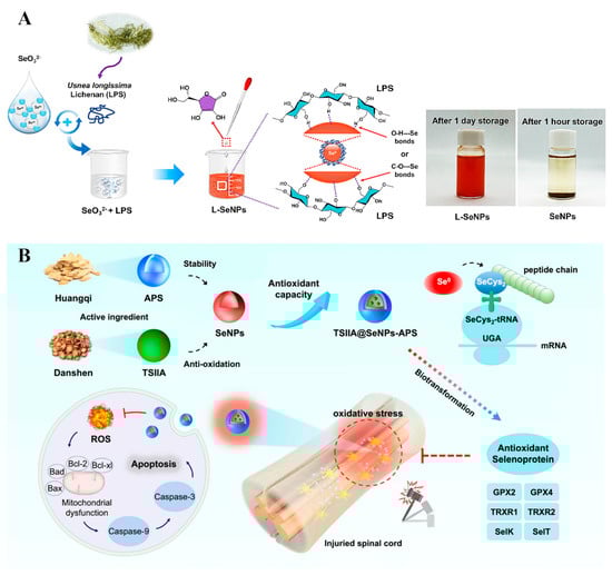 (A) Schematic diagram of synthesis of lichenan-modified SeNPs. Reprinted from [34] with permission from Elsevier. (B) Synthetic schematic diagram of TSIIA@SeNPs-APS and its regulation of antioxidant selenoproteins for SCI treatment. Reprinted with permission from [31] published under the Creative Commons Attribution license (CC BY 4.0) [66].