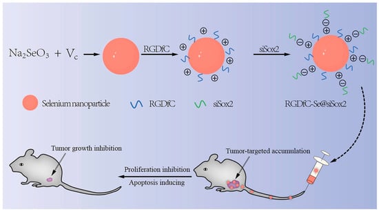 Schematic representation of functional SeNPs delivering siRNA to HepG2 for hepatocellular carcinoma treatment. Reprinted with permission from [22] published under the Creative Commons Attribution license (CC BY-NC-ND 4.0) [45].