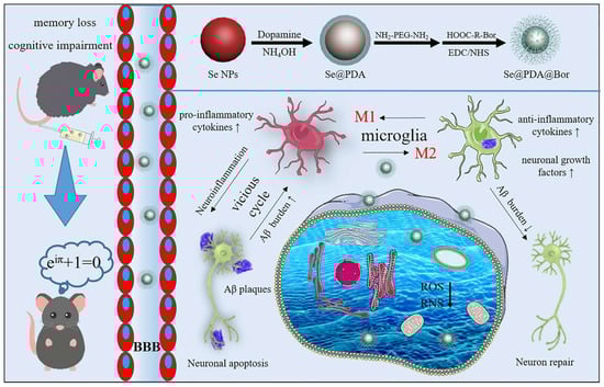 Alzheimer’s disease (AD) is a common and destructive disease characterized by the aggregation of Aβ peptides. Amyloidosis is a proteotoxic disease that affects the nervous system, and dementia is the most common form of AD [81]. Controlled release, targeted, and multi-channel therapy to inhibit Aβ aggregation is considered key to the success of AD drugs. For example, Gong et al. [80] coated PDA and borneol on the surface of SeNPs through the self-assembly and amidation reaction under alkaline conditions, which enhanced the anti-oxidation and BBB penetrating ability of SeNPs (Figure 9). In vivo and in vitro studies demonstrated that Se@PDA@Bor had multi-enzyme activity, which could remove ROS and active nitrogen (RNS), penetrate the BBB, inhibit the activation of microglia and astrocytes, reduce the release of pro-cellular inflammatory factors, alleviate neuroinflammation, break Aβ aggregation, and rescue the memory and behavior disorders of AD mice.