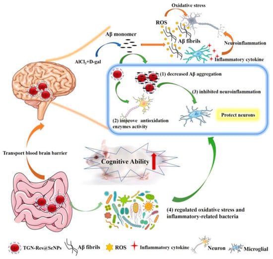 Combining resveratrol (Res) and SeNPs can improve the solubility and bioavailability of resveratrol and enhance its antioxidant activity. For instance, Abozaid et al. [83] used resveratrol to synthesize functional SeNPs in situ. The results showed that the resveratrol functionalized SeNPs could alleviate neurotoxicity, inhibit the production of Aβ, and regulate various signaling pathways involved in the pathogenesis of AD, which is expected to become another alternative drug for the treatment of AD. Similarly, Li et al. [84] decorated SeNPs with resveratrol and loaded the BBB transport peptide (TGN) on the surface to prepare the nanocomposite TGN-Res@SeNPs (Figure 10). The results showed that the TGN-Res@SeNPs could effectively inhibit the deposition of Aβ in the hippocampus, reduce oxidative stress, inhibit neuroinflammation in vivo, and alleviate intestinal microflora disorders to improve cognitive impairment, so as to achieve the purpose of treatment of AD. Conversely, Sun et al. [85] designed mesoporous SeNPs to load resveratrol, β-cyclodextrin nano-valve, and borneol. The experimental results showed that the SeNPs release system could release borneol and open BBB to reduce oxidative stress and inhibit the accumulation of Aβ through the release of resveratrol, and also improve the memory impairment of experimental mice, which demonstrated that the mesoporous SeNPs could be used as potential nanocarrier for the treatment of AD and other neurodegenerative diseases.