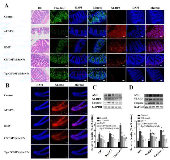 Effects of different surface modifications of SeNPs on the gut barrier permeability and protein expression level of NLRP3 in APP/PS1 mice. (A) HE staining, claudin-1 (green), and NLRP3 (red) immunofluorescence staining in mouse intestinal tissue. (B) NLRP3 immunofluorescence staining in brain tissue. (C) The protein expression level of ASC, nuclear NF-κB, and caspase-1 in the brain of mice. (D) The protein expression level of ASC, nuclear NF-κB, and caspase-1 in the intestine of mice. a–d represent significant differences among groups. Reprinted with permission from [87]. Copyright 2022, American Chemical Society.