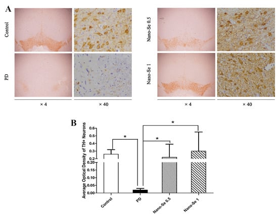 Gly@SeNPs can prevent the loss of dopaminergic neurons in rat model of PD. (A) Tyrosine hydroxylase (TH) immunohistochemistry of substantia nigra pars compacta (SNpc) sections from rats in the control group, PD model group, 0.05 mg/kg of glycine nano-selenium and 0.1 mg/kg of glycine nano-selenium. (B) The number of TH + neurons were significantly lower in the PD model group compared to the control group (* p < 0.05). Treatment with glycine nano-selenium significantly increased the number of TH + neurons as compared to the PD model group (all * p < 0.05). Reprinted from [91] with permission from Elsevier.