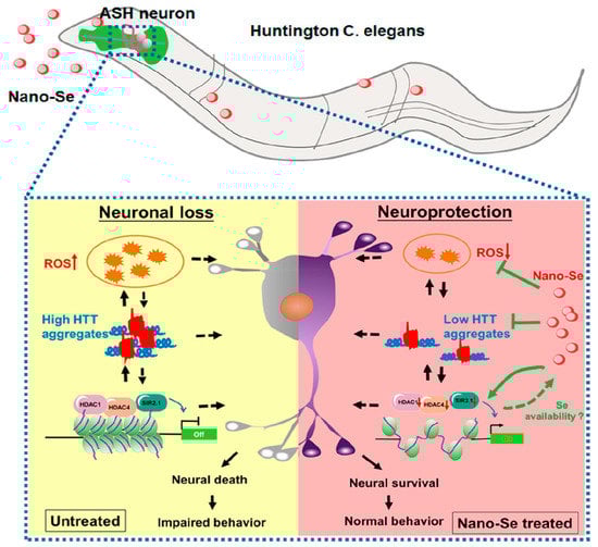Schematic diagram of neuroprotective function of SeNPs in the Caenorhabditis elegans neurodegenerative HD model. Reprinted with permission from [94]. Copyright 2019, American Chemical Society.