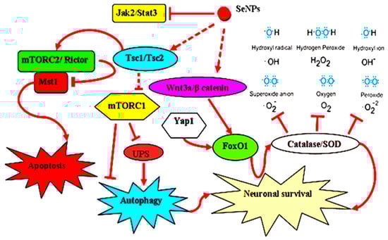 Different cellular signaling pathways that SeNPs may participate in stroke treatment. Reprinted with permission from [100] published under the Creative Commons Attribution license (CC BY 4.0) [66].