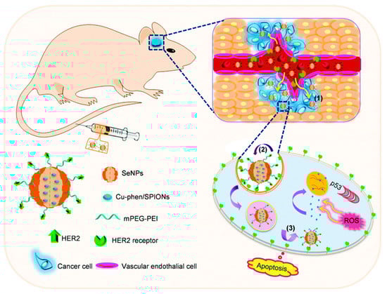Glioma is the most insidious and destructive brain tumor and the fourth leading cause of cancer-related death. All available therapies face the profound challenge of being unable to penetrate the BBB and the blood–brain tumor barrier (BBTB) to deliver systemic chemotherapy at the tumor site. Based on this, Song et al. [102] prepared an “intelligent” nano-system based on SeNPs-loaded HER2 antibodies that were modified by therapeutic agents and ultrasonic diagnostic agents. The results showed that the nano-system enhanced the BBB permeability of SeNPs by HER2 antibody, and enhanced brain tumor therapy and magnetic resonance imaging, while SeNPs inhibited the growth of tumor globules by triggering the p53 signal pathway mediated by DNA damage (Figure 16). This research provided a cancer-targeting nano-system that could overcome the BBB and hold promise for precision treatment of human malignant gliomas. In another study, Huang et al. [103] synthesized DOX-encapsulated SeNPs and loaded RGD and c-myc-siRNA into the SeNPs. Their results also suggested that the SeNPs could efficiently penetrate the BBB and achieve synergistic treatment of glioblastoma by triggering intracellular ROS overproduction and releasing DOX under acidic conditions. Chen et al. [104] designed bamboo-dervied polysaccharides functionalized SeNPs as a tumor targeting nano-system to combat BBB, thus enhancing its anti-glioma ability. To sum up, functionalized SeNPs can successfully penetrate the blood–brain barrier, providing a strong therapeutic basis for overcoming neurological disorders.