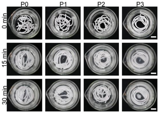 As shown in Figure 9c, the potentials of P0, P1, P2, and P3 were −13.95 ± 0.48 mV, −27.40 ± 0.27 mV, −30.55 ± 0.33 mV, and −35.54 ± 0.32 mV, respectively. The zeta potential of P3 is the most negative.