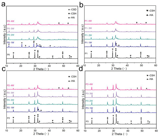Figure 2 shows XRD patterns of P0 (Figure 2a), P1 (Figure 2b), P2 (Figure 2c), and P3 (Figure 2d) after 0, 1, 2, 3, and 4 weeks of immersion. P0 generated CSD after immersion, while the other three groups did not have characteristic peaks of CSD. Since the detection limit of XRD was about 5%, it can only mean that the other three groups of bone cement did not generate CSD in large quantities. The XRD analysis of bone cement after immersion shows that the intensity of the characteristic peaks decreased with the increase in the immersion time, especially the XRD diffractograms of P0 and P1, thus indicating that the CSH or CSD content decreased.