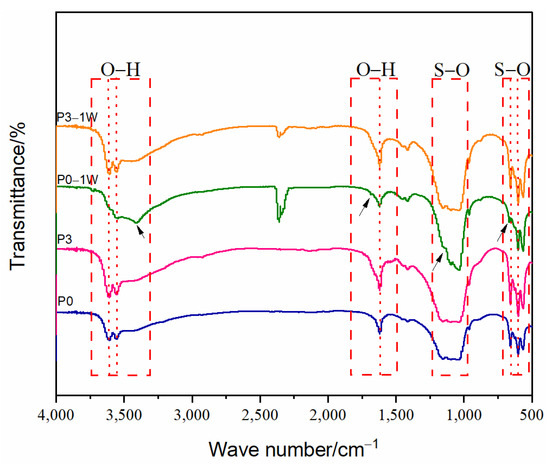 Figure 3 showed the infrared spectra of the four groups of bone cement. The infrared spectra of the P0, P3, and P3-1W (P3 sample immersed for 1 week) samples showed CSH characteristic absorption peaks at 3600 cm−1, 3550 cm−1, 1620 cm−1, 650 cm−1, and 580 cm−1. The infrared spectra of the P0-1W (P0 sample immersed for 1 week) samples showed characteristic absorption peaks of CSD at 3400 cm−1, 1680 cm−1, 1120 cm−1, and 670 cm−1 [36]. In agreement with the XRD results, CSD was generated for the P0-1W sample. The characteristic absorption peak of CSD was not seen for the P3-1W sample. This result indicates that the degradation process of P3 did not generate CSD in large quantities.