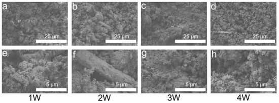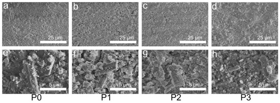 SEM images of P0 (a,e), P1 (b,f), P2 (c,g), and P3 (d,h). Images of (a–d) were obtained at 2000×, and images of (e–h) were obtained at 10,000×.