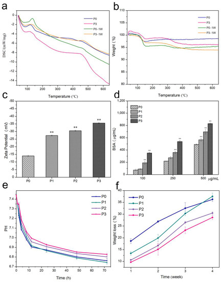 (a) DSC curves of 1-week soaked and unsoaked P0 and P3 samples; (b) TG curves of 1-week soaked and unsoaked P0 and P3 samples; (c) zeta potential of bone cement with different proportions of PRP; (d) BSA of bone cement with different proportions of PRP. Error bar indicates mean ± standard deviation: ** p < 0.01. p values of P1, P2, and P3 groups were obtained via comparison with P0 group; (e) pH of bone cement with different proportions of PRP of samples at different time points; (f) in vitro degradation behavior was measured using the weight loss ratios of the P0, P1, P2, and P3 samples after immersion in SBF solution for 1, 2, 3, and 4 weeks.
