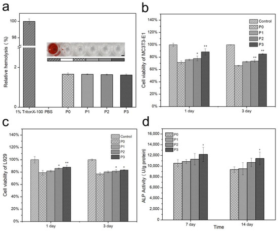 The MTT assay was performed to investigate cell cytotoxic activity. As shown in Figure 10b,c, the P1, P2, and P3 groups showed greater L929 and MC3T3-E1 viability than P0 on days 1 and 3. It can be seen that the addition of PRP promotes cell proliferation. The cellular activity of P0 was only 79.06 ± 3.81%/71.43 ± 2.64% (L929/MC3T3-E1) after one day of culture due to the decrease in pH. It is clear from the figure that pH has a greater effect on the proliferation of MC3T3-E1 cells, and the addition of PRP had a more significant effect on the promotion of cell proliferation. The cell survival rate was significantly lower for 3 days of culture than for 1 day of culture. This result is due to the addition of extracts causing cells to die, resulting in poor cell proliferation activity and, thus, a slower rate of proliferation. Eventually, as the number of days in culture increased, surviving cells became further reduced in number.