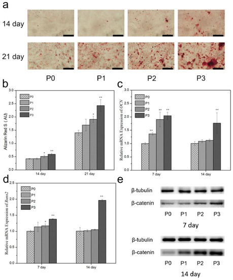 (a) ARS staining and (b) quantitative analysis of MC3T3-E1 after culturing for 14 and 21 days, with scale bar set at 200 μm; qRT-PCR analysis of expression of (c) OCN genes and (d) Runx2 genes for MC3T3-E1 after culturing for 7 days and 14 days normalized to β-actin expression of cells on P0 on that day. Error bar indicates mean ± standard deviation: * p < 0.05, ** p < 0.01. p values of P1, P2, and P3 groups were obtained via comparison with P0 group. (e) Protein expression of β-catenin via western blot measured from the MC3T3-E1 cultured for 7 days and 14 days.