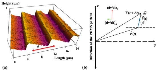 The periodic micropatterns on PDMS surfaces consist of parallel ridges separated by troughs. To prepare these patterns, we used a simple fabrication method based on imprinting diffraction grids onto PDMS substrates (details about the microfabrication methods are provided in the