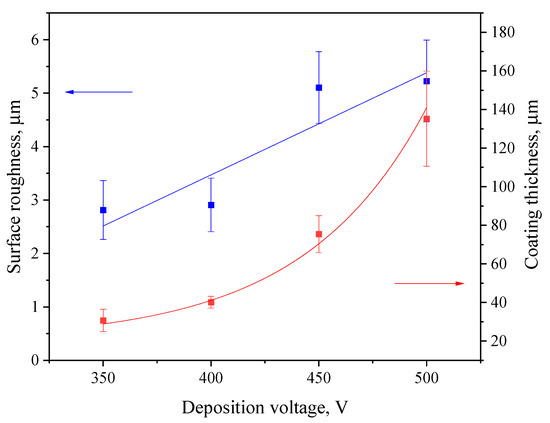 Figure 2 displays the thickness and roughness of the coatings in relation to the MAO process voltage. The thickness of deposited coatings increases exponentially, which correlates well with our previous studies related to diatomite-based coatings [48,55]. The surface roughness ranges from 2.5 to 5.0 µm, with a sharp increase at 450 V. This is due to the more intense course of the micro-arc oxidation process at higher voltages, which leads to a greater number of micro-arc plasma discharges on the substrate surface. This, in turn, leads to the merging of many small micro-discharges into one large electric arc, leading to more active intumescence of the surface and, accordingly, to the formation of a rougher topography.