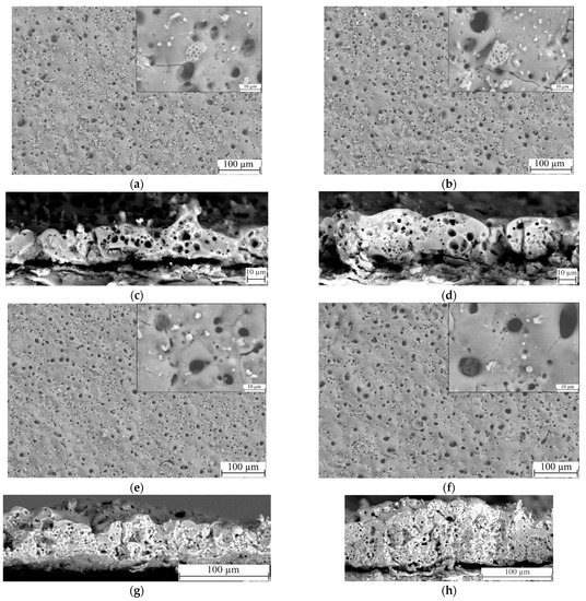 SEM micrographs of the surfaces and cross-sections of TiO2-doped diatomite coatings synthesized at different process voltages: (a,c) 350 V; (b,d) 400 V; (e,g) 450 V; (f,h) 500 V. Mag.: 500×, 5000× for (a,b,e,f); 2000× for (c,d); 1000x for (g,h).