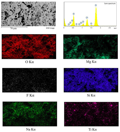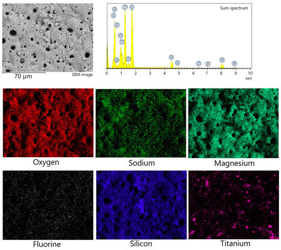 EDX analysis of the element distribution in the cross-section of the coating (Figure 5) showed that the elements O and Si are evenly distributed throughout the coating thickness, while Mg and F are mainly concentrated closer to the substrate in the transition layer. Na concentration, on the contrary, is higher in the surface layer. In addition, isolated local Ti accumulations are observed, confirming the presence of TiO2 particles in the coating volume.