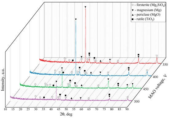 Figure 6 showcases the X-ray diffraction patterns for the TiO2-augmented diatomite coatings formed at four different process voltages. The formation of a new predominant phase is detected in all four coatings, namely forsterite (Mg2SiO4) (ICDD #34-0189), which is a magnesium orthosilicate from the olivine group of minerals. We can also see the reflexes correlating to both magnesium (ICDD #35-0821) and its oxide, namely periclase (ICDD #45-0946). The incorporation of TiO2 particles into the coating results in a few peaks corresponding to rutile (ICDD #21-1276), which is the most common natural form of titanium dioxide.