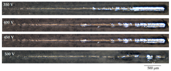 The results of the study of the mechanical properties of TiO2-augmented diatomite coatings, performed by scratch testing, showed that they have very high adhesion strength. Figure 7 shows the optical images of the coatings, applied at different voltages of the MAO process, after scratch testing. On scratches, it is possible to distinguish the zone of destruction of the coating at the moment of penetration of the indenter to the substrate—this is a solid light zone at the end of the scratch. But for the coatings applied at 500 V, this zone is practically absent, which indicates the highest adhesion strength of these coatings.