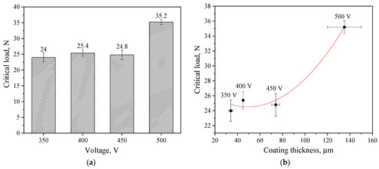 The determination of the critical load at failure confirmed these results. A diagram of the critical load versus voltage at which the coating was formed is shown in Figure 8a. The figure shows that the critical load values for coatings applied at 350–450 V are approximately the same, ranging from 24.0–25.4 N. However, the coating applied at 500 V is characterized by the highest critical load value of 35.2 N. The results obtained in previous studies show that diatomite-based coatings without TiO2 particles have much lower adhesion strength. The maximum critical load did not exceed 10 N [48].