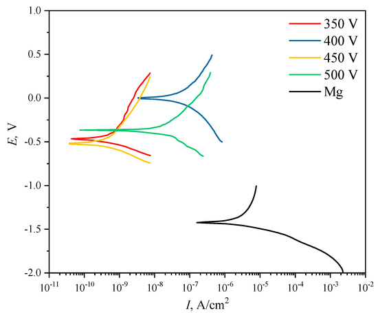 A comparative analysis of the properties of the coatings deposited at different stresses of the MAO process was carried out, and it was concluded that the coatings formed at 350 and 450 V are the most promising for practical application in terms of the set of optimal properties. These coatings are characterized not only by sufficient thickness and roughness and high adhesive strength, but also by the highest corrosion resistance, exceeding that in the works of other authors [56,57]. They had the highest values of polarization resistance at 1.22 × 108 Ω cm2 and 1.41 × 108 Ω cm2, respectively, and the lowest values of corrosion current density at 3.3 × 10−10 A cm–2 and 4.0 × 10−10 A cm−2, respectively.
