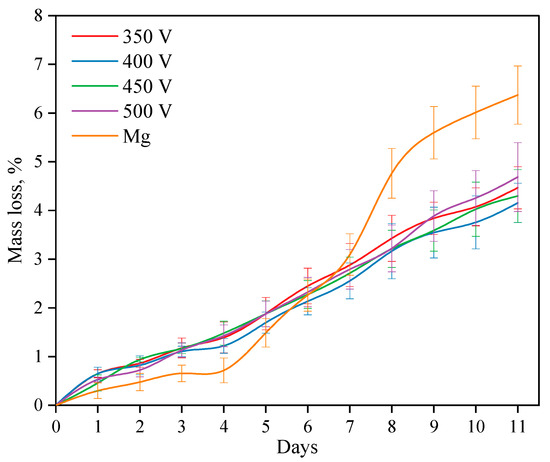 The processes of dissolution of both coated and uncoated alloy samples were studied for 11 days while kept in a 0.9% NaCl solution (Figure 10). Studies have shown that when a Mg alloy is dissolved, three periods can be distinguished. During the first period, i.e., during the first 4 days, the dissolution rate of the alloy is lower than the dissolution rate of samples with coatings. After 4 days, the dissolution rate increases sharply and exceeds the dissolution rate of the coated samples. After 8 days, the dissolution rate slightly decreases again. As described in previous studies, the dissolution rate of the Mg alloy directly depends on two processes: the first is the dissolution of alloy components, while the second is the process of reverse precipitation of dissolution products (magnesium hydroxide Mg(OH)2) on the alloy surface. If the first process prevails, the dissolution rate increases, but if the second process prevails, the alloy dissolves more slowly.