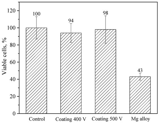 Cell viability was assessed using the MTT assay and quantified according to Equation (2). Compared to the control, coating 400 V and coating 500 V-treated cells showed no statistically significant decrease in viability; cell viabilities were about 94% and 98% of that of the control, respectively (Figure 12). At the same time, the Mg alloy-treated NIH/3T3 cells showed decreased viability, and the cell viability was approximately 43% (high toxicity). Based on these results, it is safe to say that the coatings significantly reduce the toxicity of the samples.