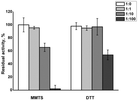 Residual activity of papain after blocking of the free thiol group with MMTS, and its recovery with DTT treatment. Molar ratios papain:MMTS were in the range from 1:0 to 1:100. Values are presented as the averages of triplicates, and the error bars show the relative standard deviations.