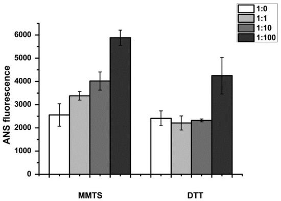 ANS fluorescence of papain after blocking of the free thiol group with MMTS, and its recovery with DTT treatment. Molar ratios papain:MMTS were in the range from 1:0 to 1:100. Values are presented as the averages of pentaplicates, and the error bars show the relative standard deviations.